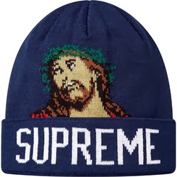 Last time we saw a jesus symbol pop out in contemporary fashion was when a model looking like Jesus joined Kanye West on stage during his tour. Now Supreme have added this inri beanie in different colorways. Retails for £26.